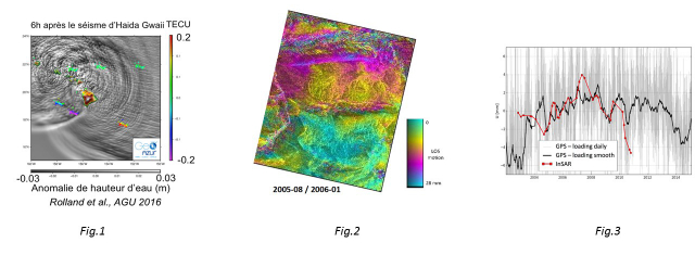 - l’étude des déformations en surface (sur Terre avec INSAR, GPS, Sentinel mais aussi sur Mars avec INSIGHT) et des variations du champ de gravité terrestre (mission GRACE, mesures absolues et relatives au sol de la pesanteur) pour caractériser les processus profonds ou superficiels qui en sont à l’origine.